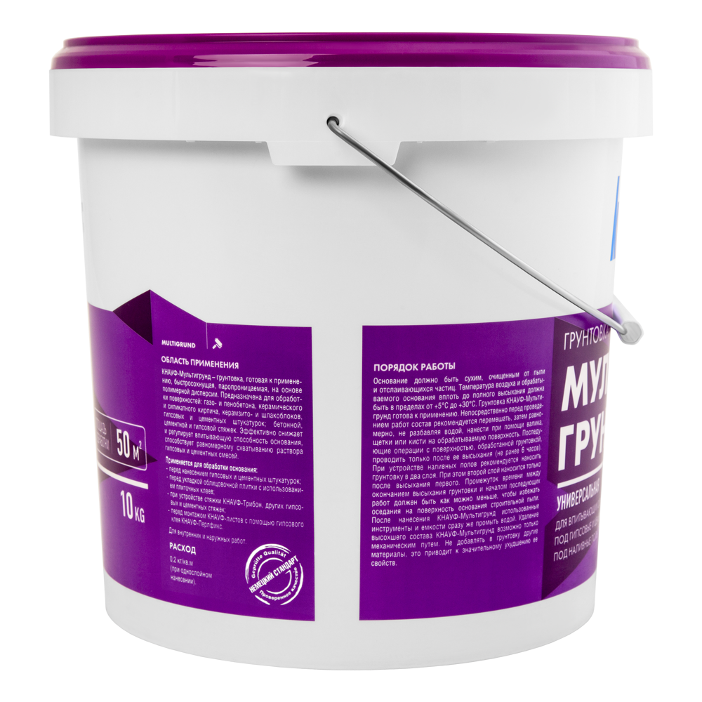 Грунтовка КНАУФ МУЛЬТИГРУНД готова к применению. Непосредственно перед проведением работ состав рекомендуется перемешать, затем равномерно, не разбавляя водой, нанести при помощи валика, кисти, щетки или распылителя на обрабатываемую поверхность. Последующие операции с поверхностью, обработанной грунтовкой, проводить только после ее высыхания (не ранее, чем через 6 часов). Промежуток времени между окончанием высыхания грунтовки и началом последующих работ должен быть как можно меньше,
