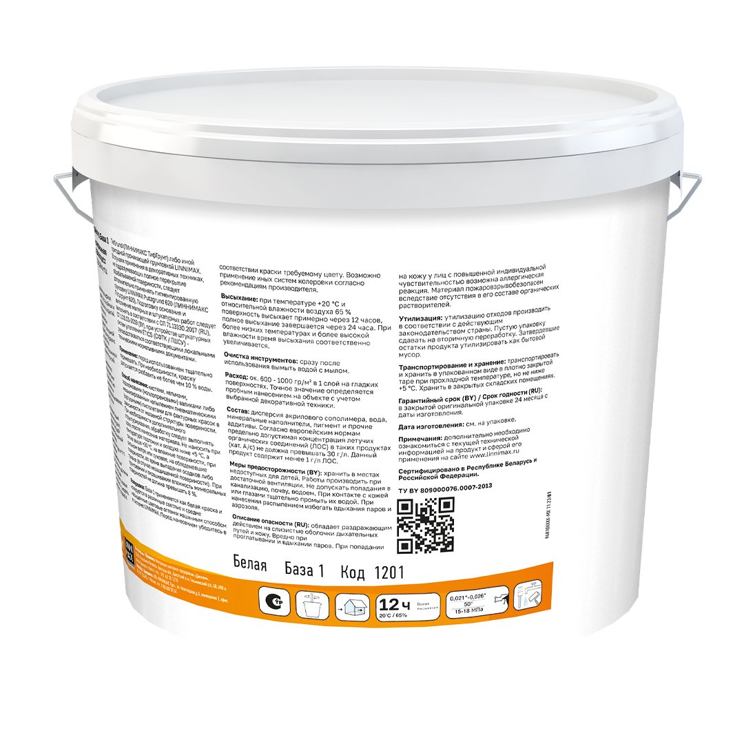 Срок годности 24 месяца с даты производства. Хранить в местах недоступных детям. Защищать глаза и кожу от попадания брызгав краски. При попадании в глаза и на кожу сразу же основательно промыть водой. Не вдыхать образующийся туман при нанесении краскопультом. Не допускать попадания в канализацию, водоемы и на почву.