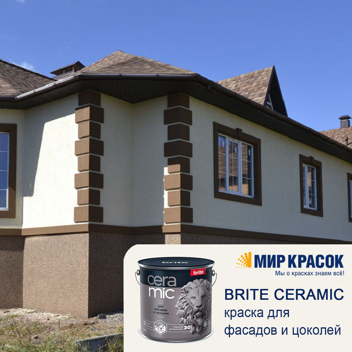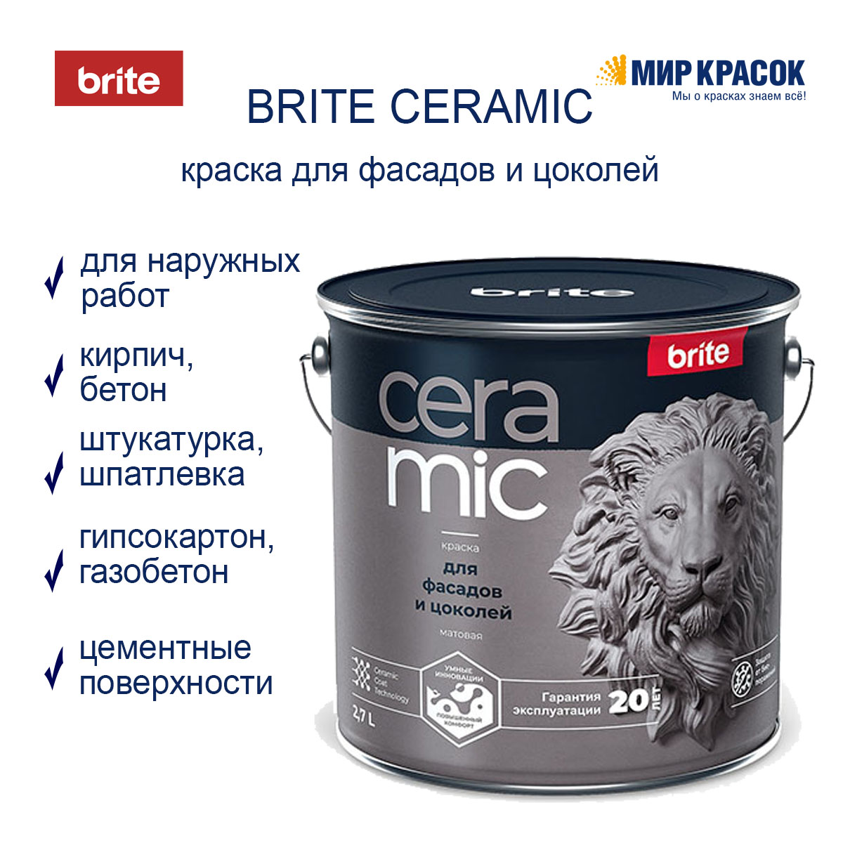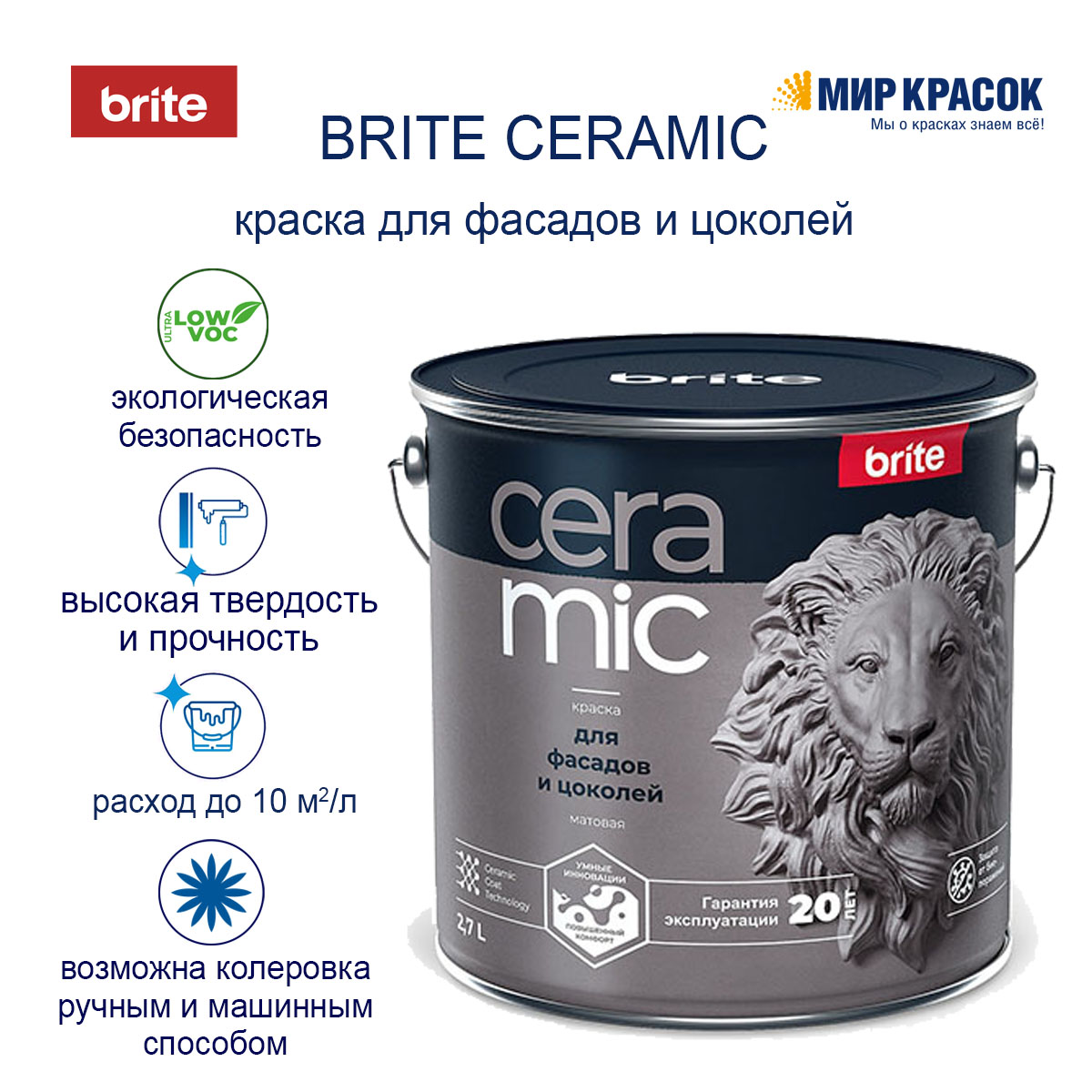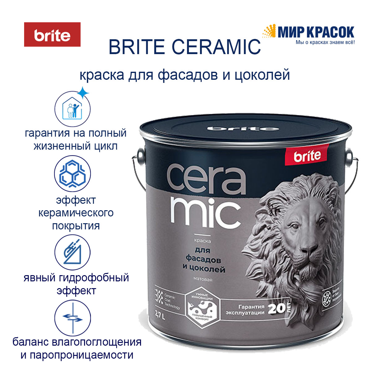 Краска Brite Ceramic для фасадов и цоколей матовая образует сверхпрочное покрытие, устойчивое к агрессивной среде и к широкому спектру загрязнений. Умные технологии обеспечивают идеальный баланс паропроницаемости и влагопоглощения и гарантируют целостность покрытия в течение 20 лет.