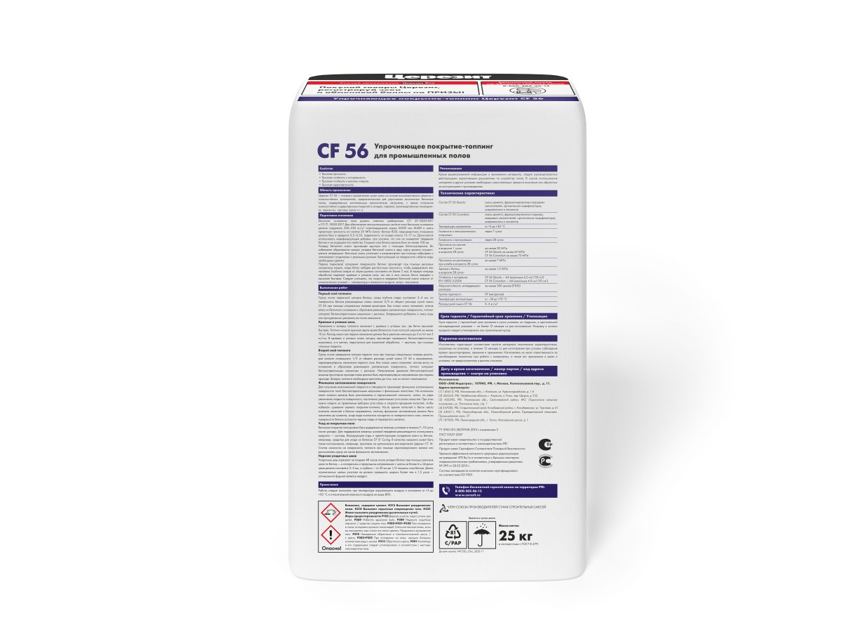 Ceresit CF 56 Quartz - упрочняющее покрытие-топпинг, готовая к применению сухая смесь на основе высокоактивного цемента и кварцевого заполнителя, предназначена для упрочнения монолитных бетонных полов, эксплуатирующихся в условиях умеренных и значительных механических нагрузок с целью получения износостойких («мало пылящих») и ударопрочных покрытий с высокой стойкостьюк загрязнениям маслами и жирами. Применяется для устройства покрытий пола в логистических центрах, складах, производственных помещениях, гаражах, паркингах, торговых залах, развлекательных центрах и т. п.