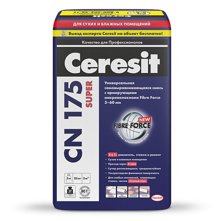 Ceresit CN 175 Super - универсальная самовыравнивающаяся смесь с армирующими микроволокнами Fibre Force (от 3 до 60 мм).
