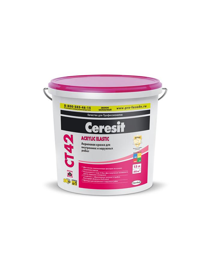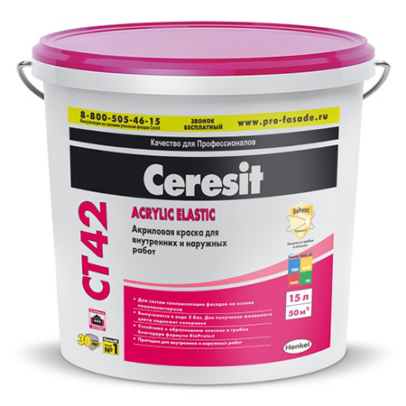 Ceresit CT 42 Acrylic Elastic - акриловая краска, предназначенная для окрашивания минеральных и акриловых декоративных штукатурных покрытий, таких как Ceresit CT 35, CT 137, CT 60, CT 63 и CT 64, а также бетона, цементно-песчаных, цементно-известковых и известковых штукатурок, как внутри, так и снаружи зданий.