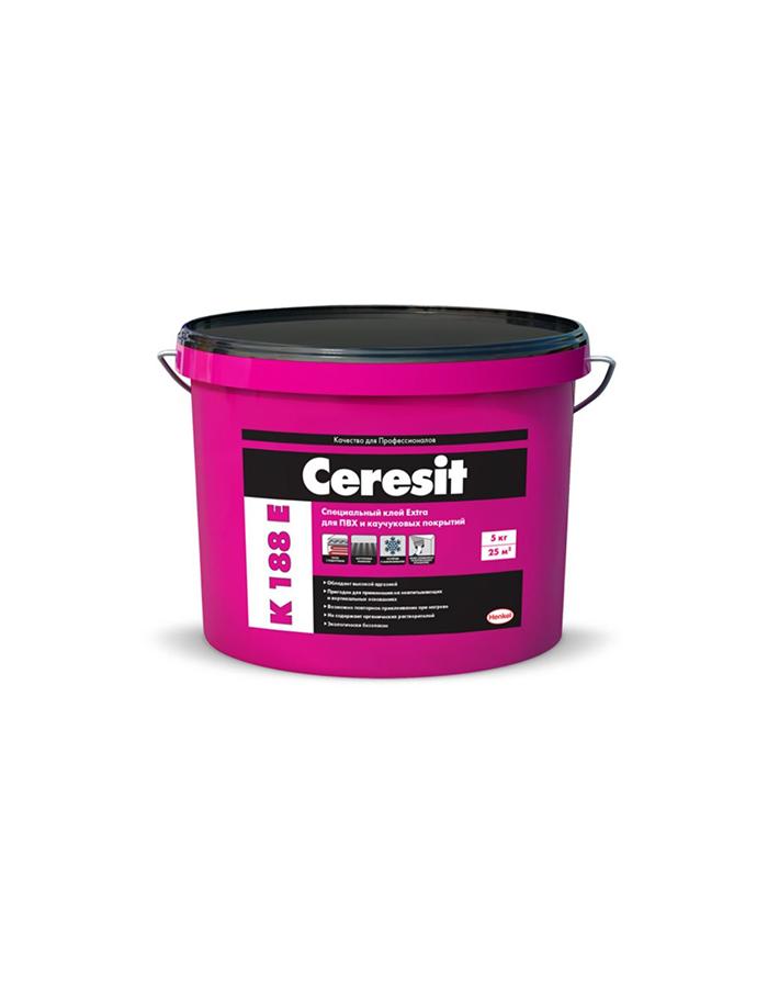 Ceresit K 188E Extra - клей, предназначенный для укладки ПВХ и каучуковых покрытий на впитывающие и невпитывающие основания пола (цементно-песчаные стяжки, бетон, плиточные облицовки, существующие ПВХ покрытия и т.д.) в жилых и общественных помещениях. Пригоден для контактного приклеивания ПВХ и каучуковых покрытий на ступенях лестниц и ПВХ покрытий на стенах.