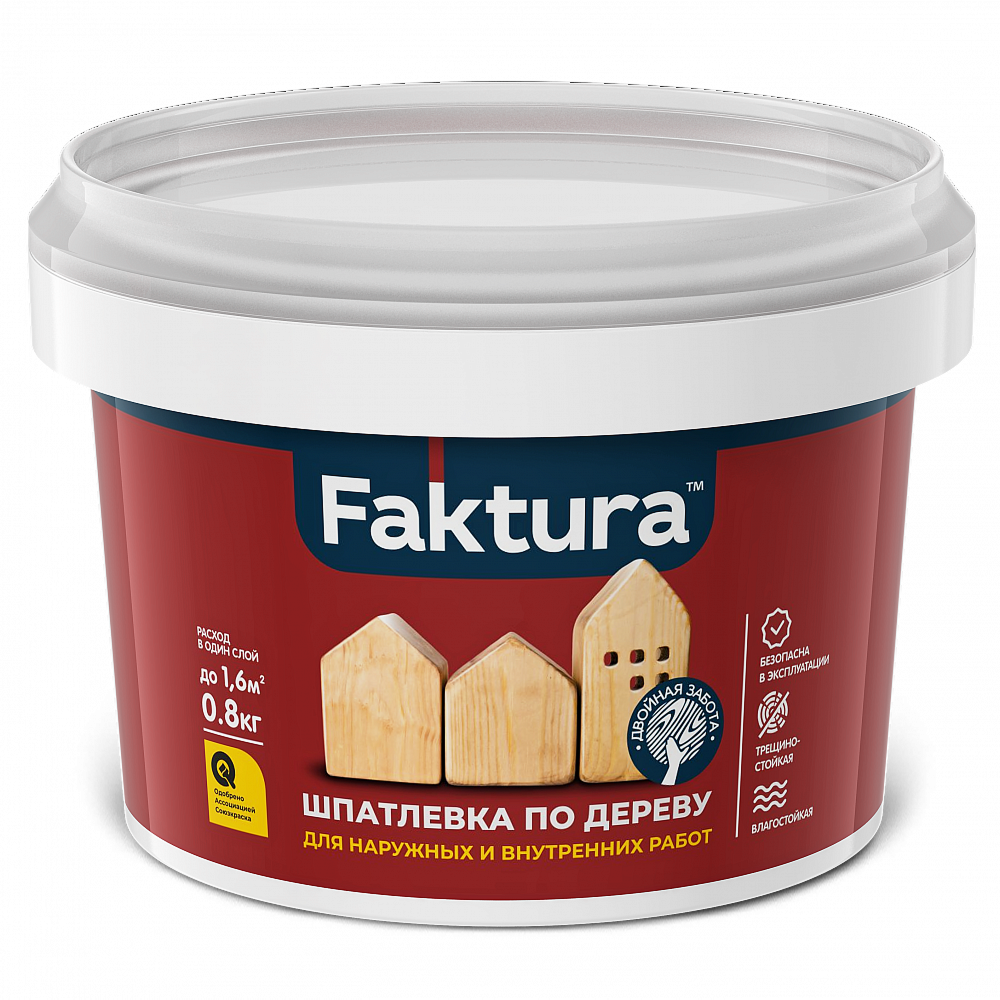 Шпатлевка FAKTURA™ по дереву предназначена для финишного выравнивания и устранения неровностей и углублений на деревянных поверхностях (паркет, мебель, окна, двери, вагонка и т.д.), ДСП, эксплуатируемых в атмосферных условиях и внутри помещений, в т.ч. с повышенной влажностью для последующей окраски лаками, пропитками, эмалями.