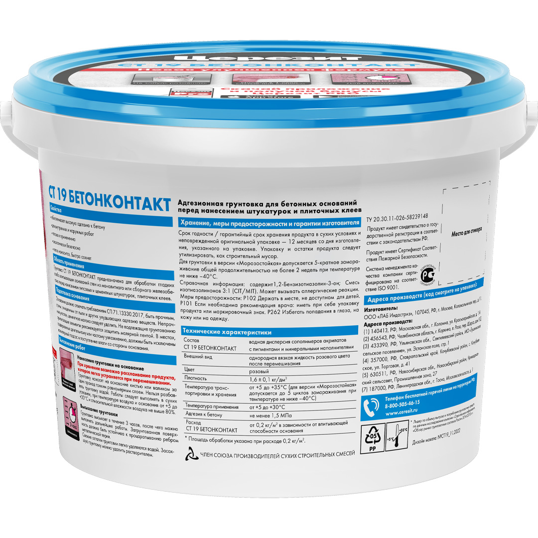 В составе — минеральные наполнители. Грунтовка используется для обработки гладких бетонных поверхностей с целью придать им шероховатость для последующего нанесения минеральной штукатурки и наклейки плитки. За счет этого достигается высокая адгезия к основанию. Показатель адгезии к бетону составляет более 1 МПа, плотности — 1,5-1,7 кг/дм3.