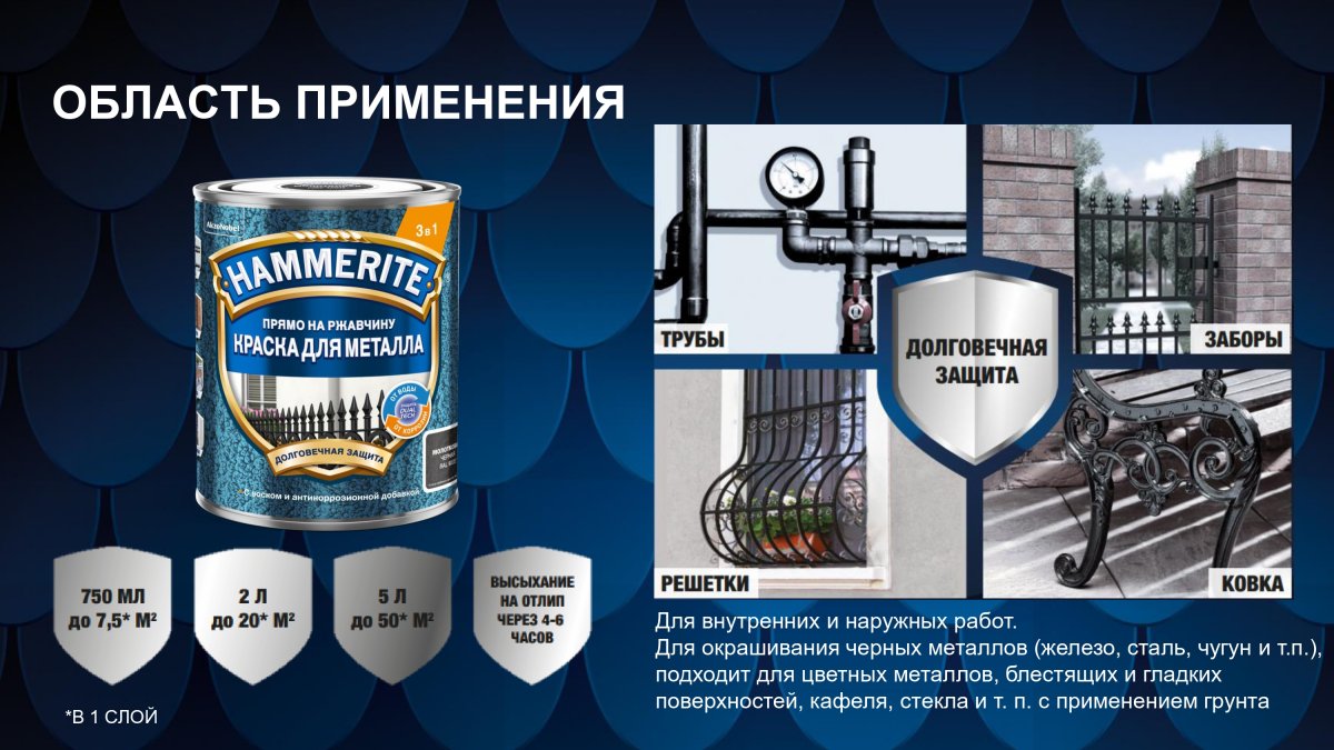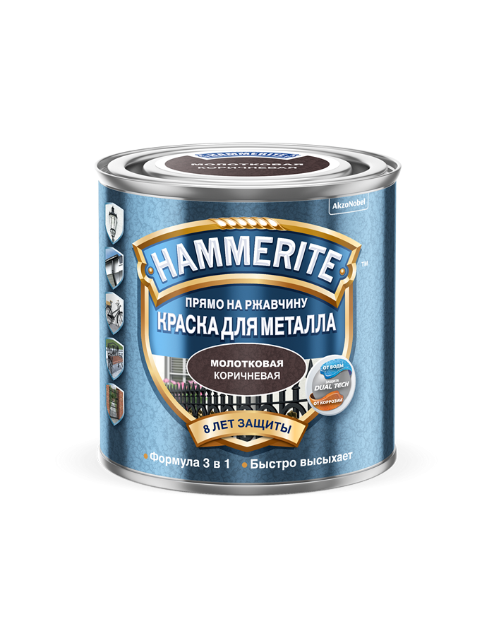 Хорошо защищает изделия из черных и цветных металлов (решетки, заборы, ворота, мебель для сада) от ржавчины и создает на поверхности эстетичный молотковый узор.