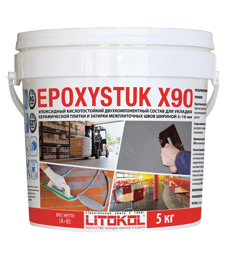 EPOXYSTUK X90 соответствует классу RG — затирочный состав на основе реактивных смол (R) для межплиточных швов (G), классу R2T — клей на основе реактивных смол (R) улучшенного качества (2), с нулевым вертикальным сползанием (T).