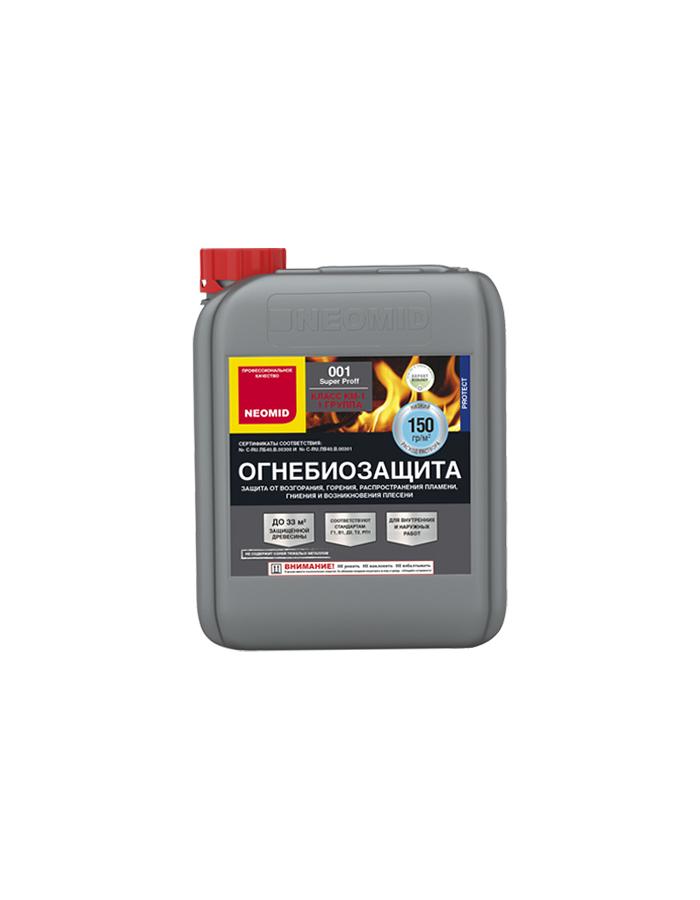 Обеспечивает класс пожарной опасности материалов КМ1 согласно Федерального закона №123 от 22.07.2009 г. (Г1 (ГОСТ 30244-94), В1 ( ГОСТ1 30402-96), Д2(ГОСТ 12.1.044-89), Т2(ГОСТ 12.1.044-89), РП1(ГОСТ Р 51032-97)). Обеспечивает показатель группы горючести Г2 по ГОСТ 30244-94.Предназначен для обработки декоративно-отделочных, облицовочных материалов и покрытий, используемых при отделке путей эвакуации, в зданиях различного функционального назначения, этажности и вместимости.