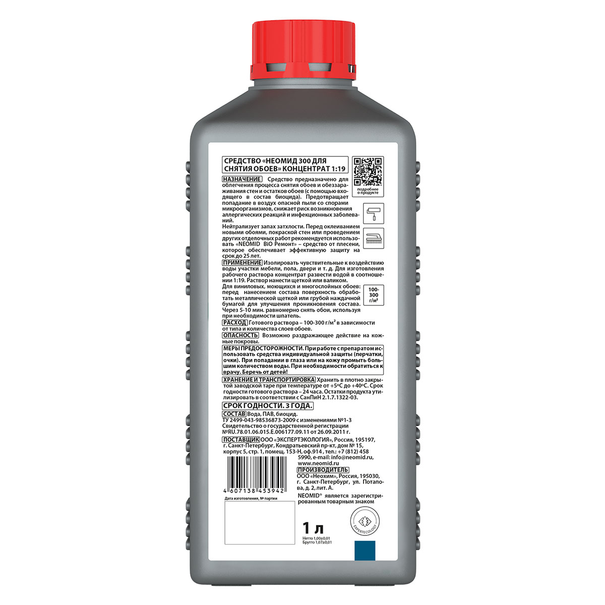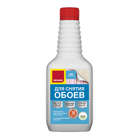 «NEOMID для снятия обоев» предназначен для облегчения процесса снятия обоев и обеззараживания стен и остатков обоев (с помощью входящего в состав биоцида). Предотвращает попадание в воздух опасной пыли со спорами микроорганизмов, снижает риск возникновения аллергических реакций и инфекционных заболеваний. Нейтрализует запах затхлости. Быстро впитывается и проникает в старые обои на глубину до 10 слоев. Перед оклеиванием новыми обоями, покраской стен или проведением других отделочных работ, рекомендуется использовать «NEOMID BiO Ремонт» (средство от плесени, которое обеспечивает эффективную защиту на срок до 25 лет).