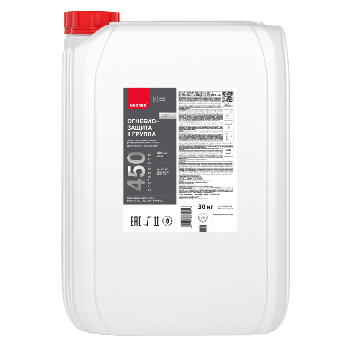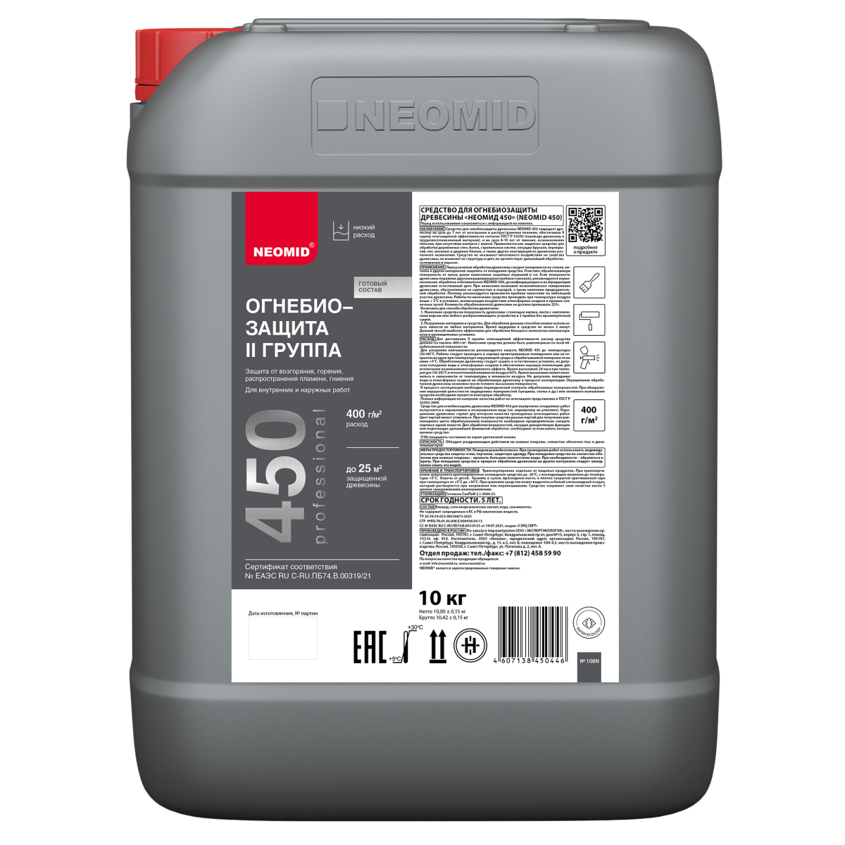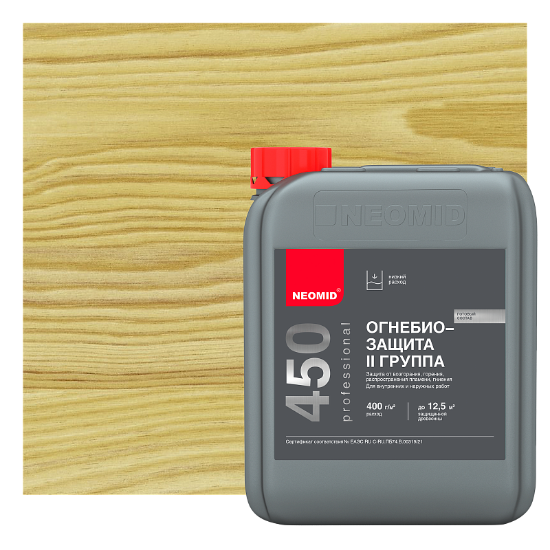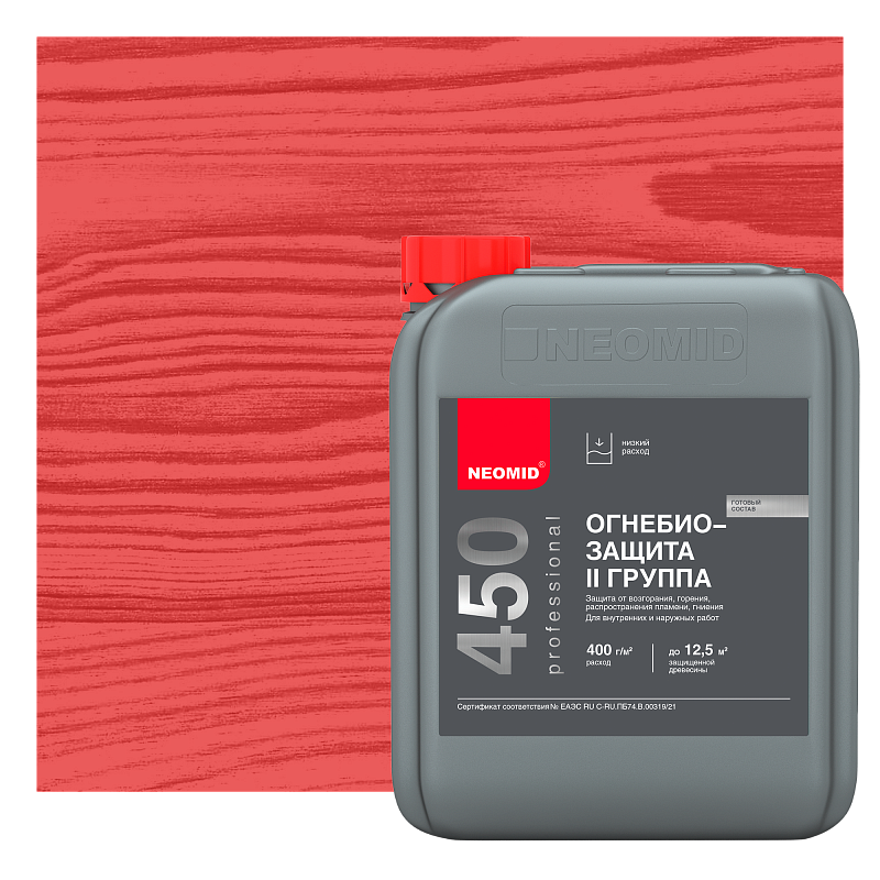 NEOMID 450 защищает древесину на срок до 7 лет от возгорания и распространения пламени, обеспечивая II группу огнезащитной эффективности согласно ГОСТ Р 53292 (переводя древесину в трудновоспламеняемый материал), и на срок 8-10 лет от гниения, возникновения плесени, при отсутствии контакта с влагой. Применяется как защитная пропитка для обработки деревянных стен, балок, стропильных систем, несущих брусьев, перекрытий, лаг, оконных и дверных блоков, а также других конструкций из древесины различного назначения.
