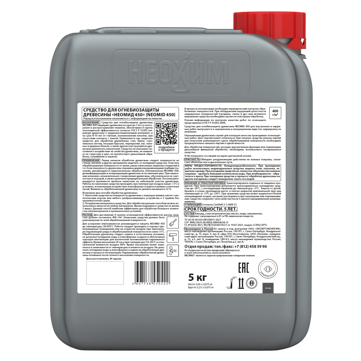 Хранить в сухом, прохладном месте в плотно закрытой оригинальной таре. При хранении средства может выделяться белый хлопьевидный осадок, который растворяется при нагревании или перемешивании. Средство сохраняет свои свойства после 5 циклов замораживания-размораживания. NEOMID 450 пожаровзрывобезопасен. Утилизация согласно СанПин 21.7.1322-03.