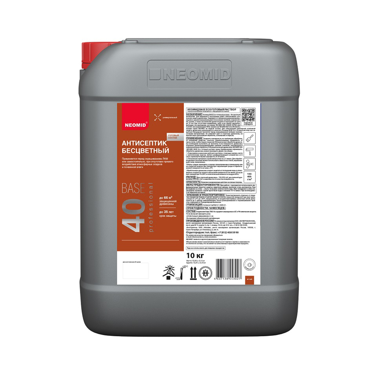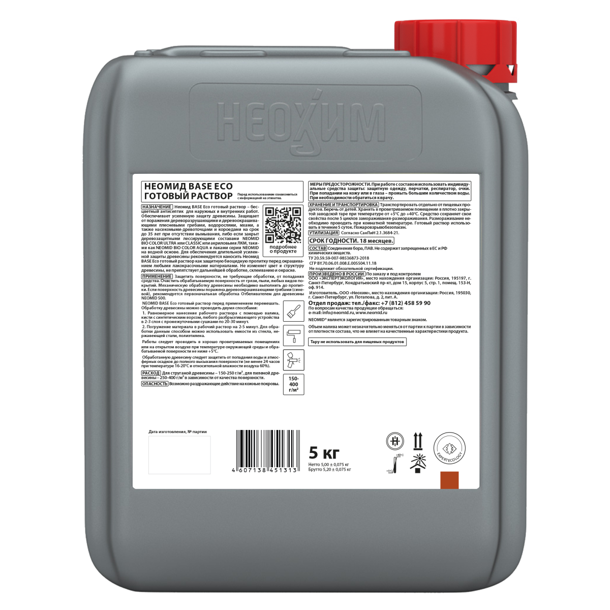 Неомид BASE Eco готовый раствор» – бесцветный антисептик для наружных и внутренних работ. Обеспечивает усиленную защиту древесины. Защищает от поражения дереворазрушающими и деревоокрашивающими плесневыми грибами, водорослями, мхами, а также насекомыми-древоточцами и короедами на срок до 35 лет при отсутствии вымывания, либо если закрыт деревозащитными лессирующими составами NEOMID BiO COLOR ULTRA или CLASSIC или акриловыми ЛКМ, такими как NEOMID BiO COLOR AQUA и лаками серии NEOMID на водной основе.
