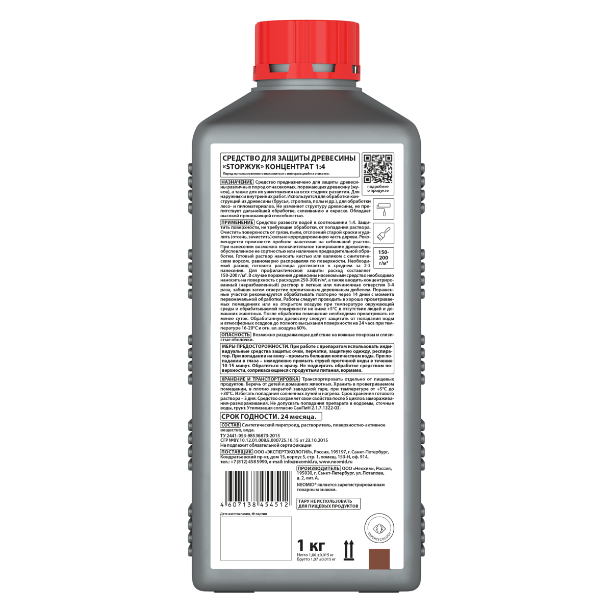 Рекомендуется произвести пробное нанесение на небольшой участок. При нанесении возможно незначительное тонирование древесины, обусловленное ее сортностью или наличием предварительной обработки. Готовый раствор наносить кистью или валиком с синтетическим ворсом, равномерно распределяя по поверхности. Необходимый расход готового раствора достигается в среднем за 2-3 нанесения. Для профилактической защиты расход составляет 150-200 г/м2. В случае поражения древесины насекомыми препарат необходимо наносить на поверхность с расходом 250-300 г/м2, а также вводить концентрированный (не разбавленный) раствор в летные или личиночные отверстия 3-4 раза, забивая затем отверстие пропитанным деревянным дюбелем. Пораженные участки рекомендуется обрабатывать повторно через 14 дней с момента первоначальной обработки. Работы следует проводить в хорошо проветриваемых помещениях или на открытом воздухе при температуре окружающей среды и обрабатываемой поверхности не ниже +5°С в отсутствии людей и домашних животных. После обработки помещение необходимо проветривать не менее суток. Обработанную древесину следует защитить от попадания воды и атмосферных осадков до полного высыхания поверхности.МЕРЫ ПРЕДОСТОРОЖНОСТИ: При работе с препаратом использовать индивидуальные средства защиты: очки, перчатки, защитную одежду, респиратор. При попадании на кожу - промыть большим количеством воды. При попадании в глаза - немедленно промыть струей проточной воды в течение 10-15 минут. Обратиться к врачу. Не подвергать обработке средством поверхности, соприкасающиеся с продуктами питания, кормами.