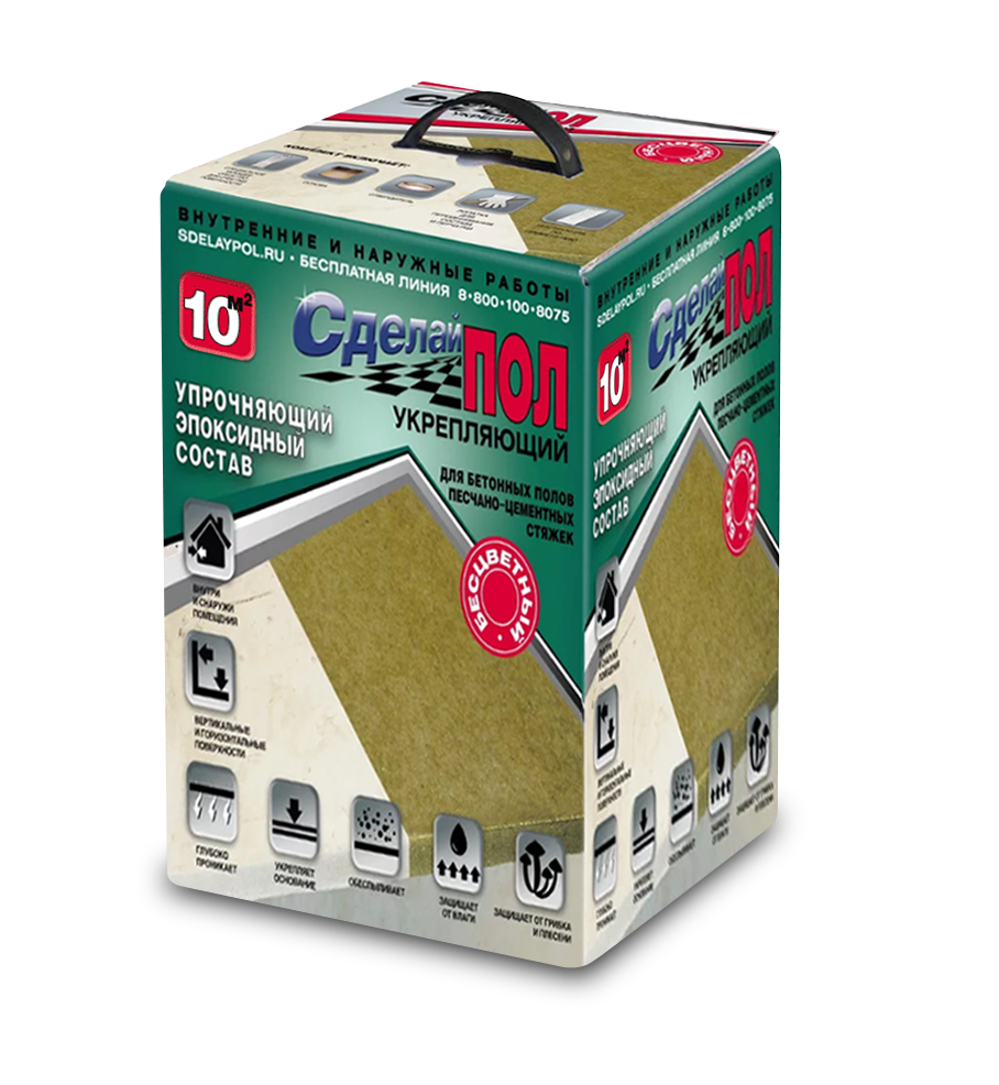 Сделай Пол «Укрепляющий» - двухкомпонентный эпоксидный состав глубокого проникновения, предназначен для упрочнения и обеспыливания бетонных полов, а также для защиты и консервации деревянных поверхностей от влаги.
