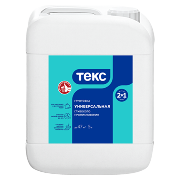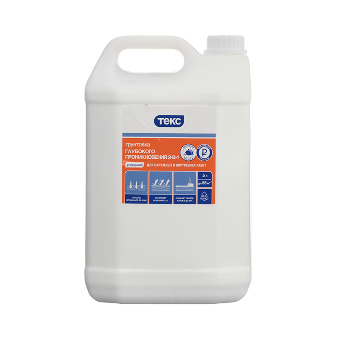Область применения: Предназначена для грунтования бетонных, оштукатуренных, гипсокартонных, кирпичных и деревянных поверхностей перед последующей окраской водно-дисперсионными красками, шпатлеванием, облицовкой керамической плиткой и наклейкой обоев внутри сухих помещений и помещений с повышенной влажностью (кухни, ванные, коридоры и др.). Рекомендуется также для наружных работ для грунтования фасадов перед применением Краски фасадной "Универсал" ТЕКС. Грунтовка глубоко проникает (до 6мм) и укрепляет основание, улучшает сцепление покрытия с поверхностью, выравнивает впитывающую способность подложки.