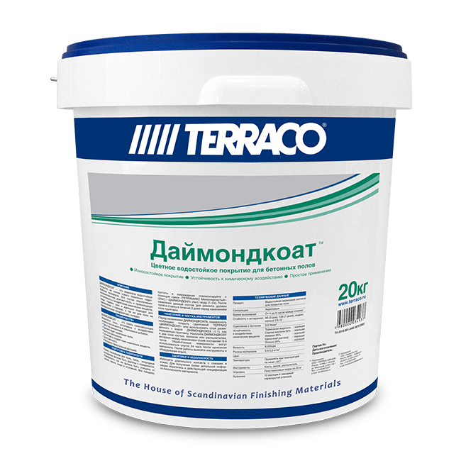 Даймондкоат – это акриловое водостойкое покрытие на основе нового поколения гидрофобных полимеров. Его состав обеспечивает необыкновенную долговечность и превосходную устойчивость к воздействию многих химических веществ, технических жидкостей и воды. Обладает повышенной устойчивостью к механическим повреждениям, разработан специально в качестве защитного окрасочного покрытия для эксплуатируемых бетонных полов при выполнении работ снаружи и внутри зданий.