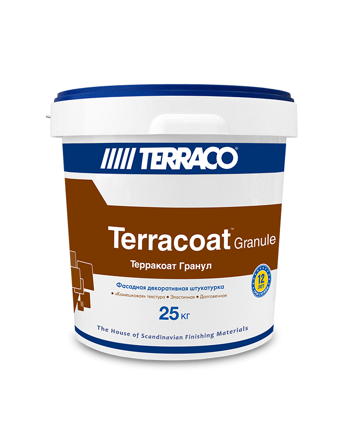 Терракоат Гранул - это готовое к применению финишное декоративное штукатурное покрытие на акриловой основе с выраженной наполненной зернистой текстурой типа «шуба». Материал обеспечивает сочетание качественной архитектурной отделки с экономичностью, легкостью нанесения и долговечностью, обладает превосходной адгезией к большинству типов внешних и внутренних поверхностей, характеризуется уникальными водоотталкивающими свойствами, великолепной повышенной эластичностью, устойчивостью к механическим воздействиям и трещинообразованию. Материал предлагается в виде 4 фракций:1.0, 1.5, 2.0, 2.5 мм.