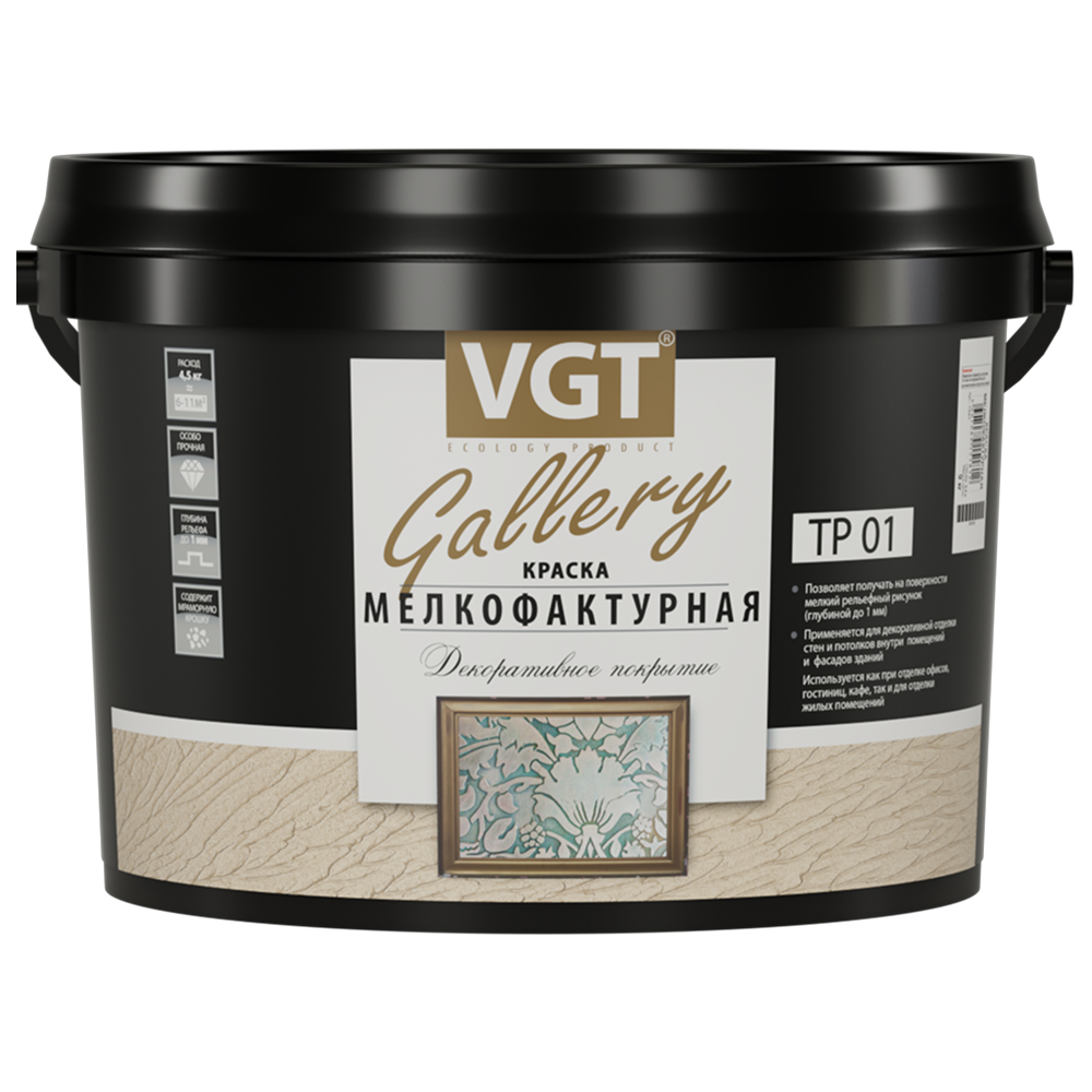 Краска представляет собой белую, вязкую, однородную массу. После высыхания образует декоративное рельефное покрытие, обладающее высокой твердостью, водо- и атмосферостойкостью. Выдерживает влажную уборку.