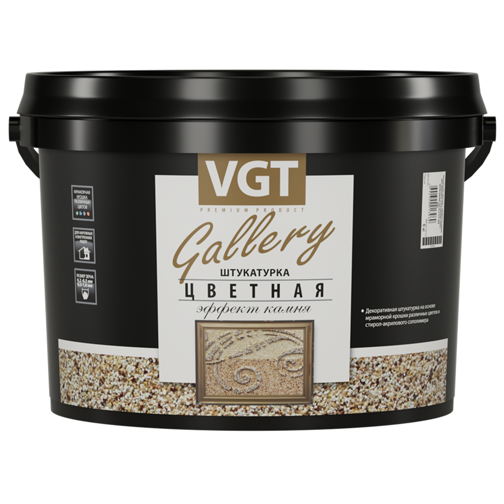 VGT Gallery мелкозернистая цветная штукатурка с эффектом камня на основе стирол-акрилового сополимера с наполнителем из мраморной крошки используется для финишной отделки фасадов и помещений.