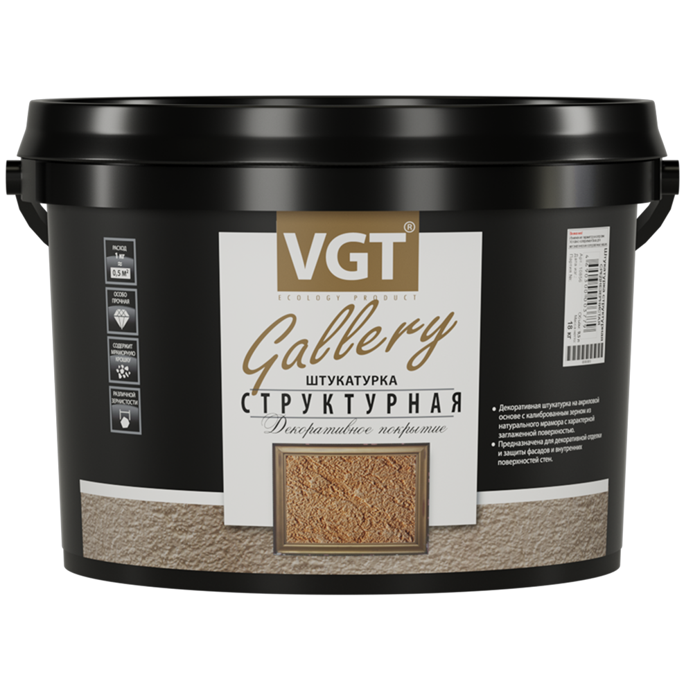 Штукатурка представляет собой вязкую однородную массу с рельефообразующим наполнителем. Материал обладает высокой адгезией к минеральным поверхностям, а также к ДСП, гипсокартону и др. Обладает высокой прочностью, водо- и атмосферостойкостью. Образует “дышащее” покрытие. Может окрашиваться сверху.