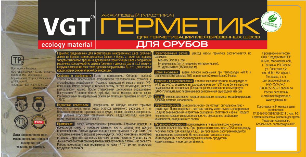 Готов к применению. Плотность 1500 кг/м³. Обладает высокой эластичностью. Обеспечивает эффективную теплоизоляцию. Устойчив к атмосферным воздействиям (надежно защищает от ветра и влаги), УФ-излучению. Имеет высокую адгезию к дереву, бетону, штукатурке, кирпичу, натуральному камню. После отверждения допускается окрашивание. Выпускается различных цветов. Рекомендуемый температурный режим эксплуатации герметика от -40°С до +70°С.