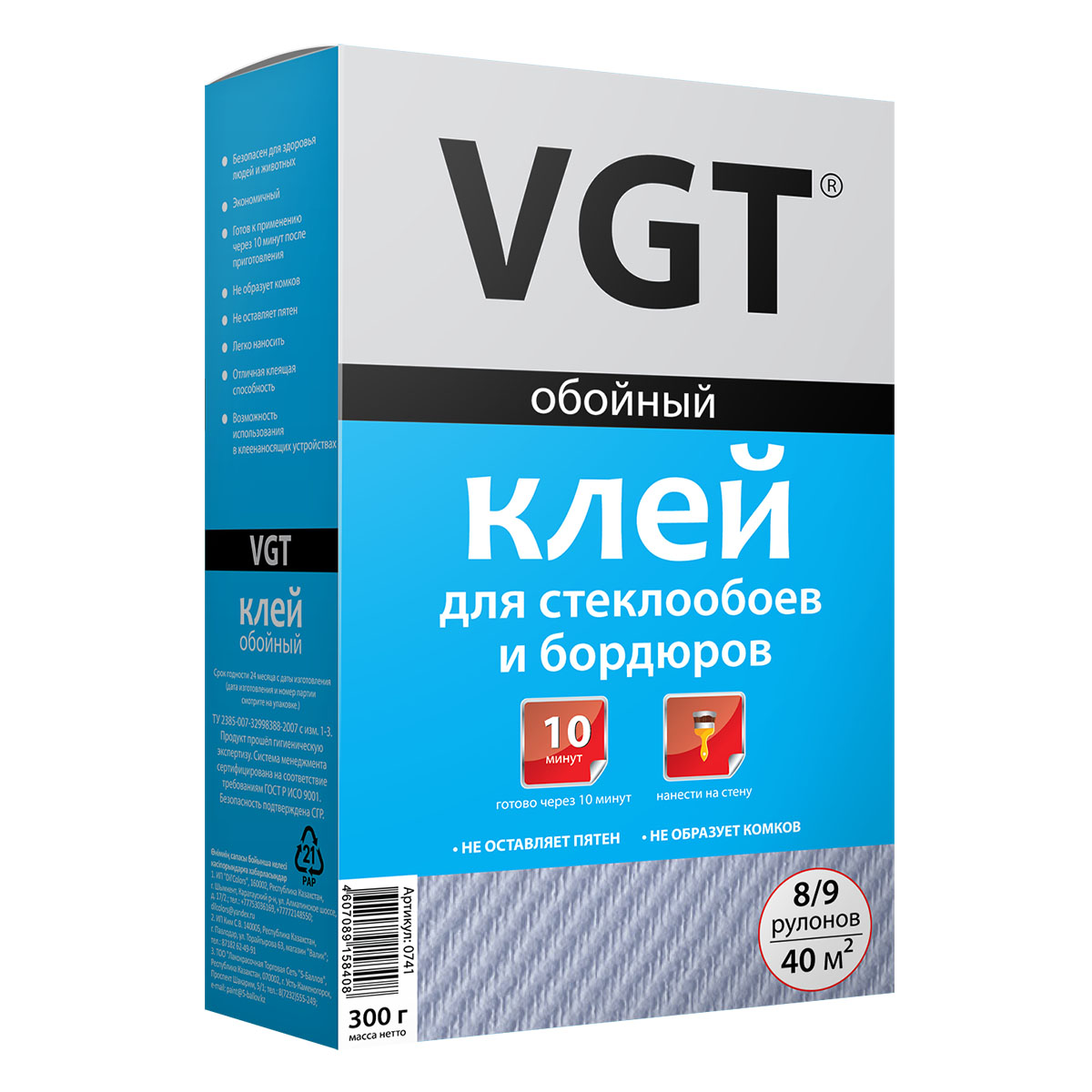 VGT клей сухой предназначен для наклеивания стеклообоев и бордюров на бетонные, оштукатуренные, деревянные и другие поверхности.