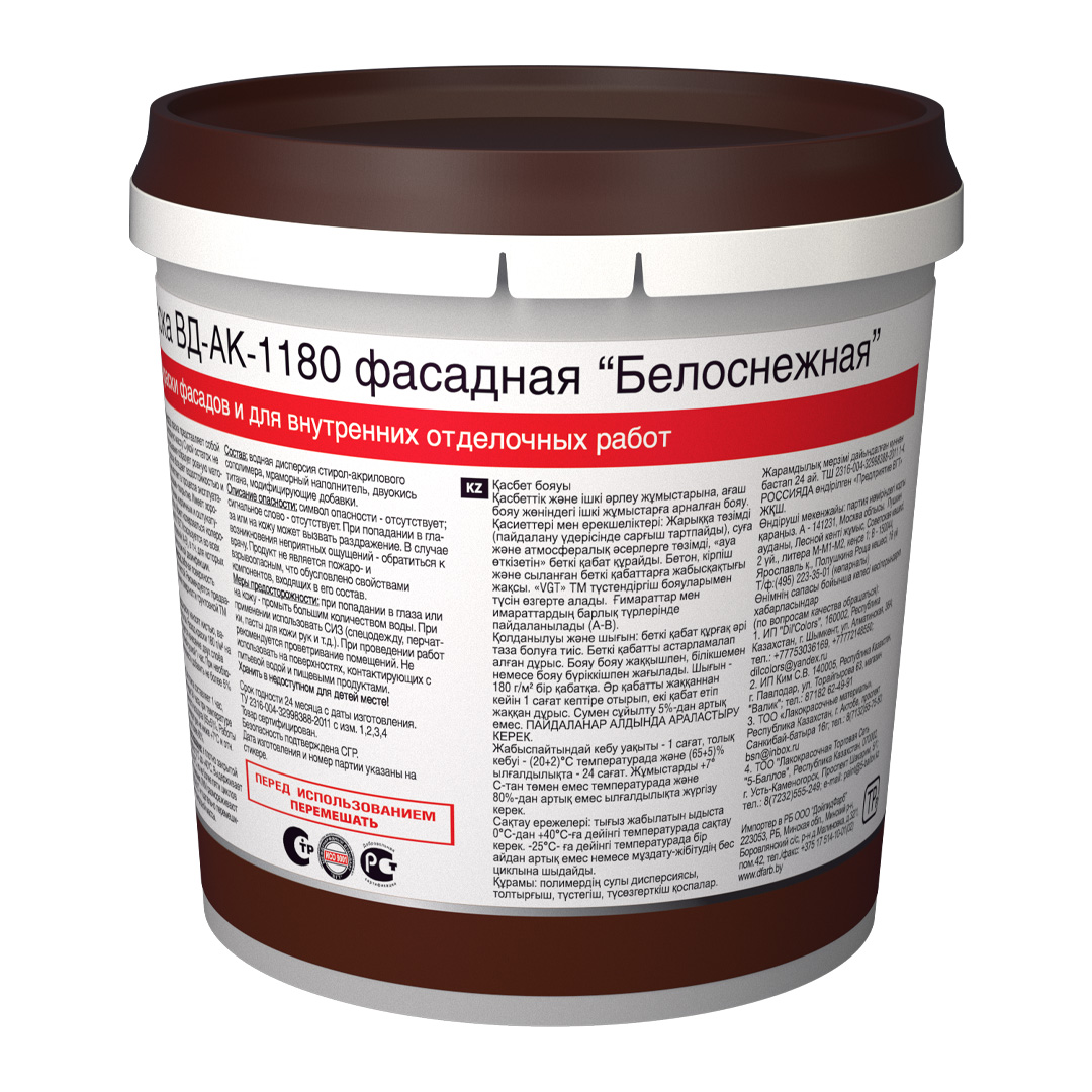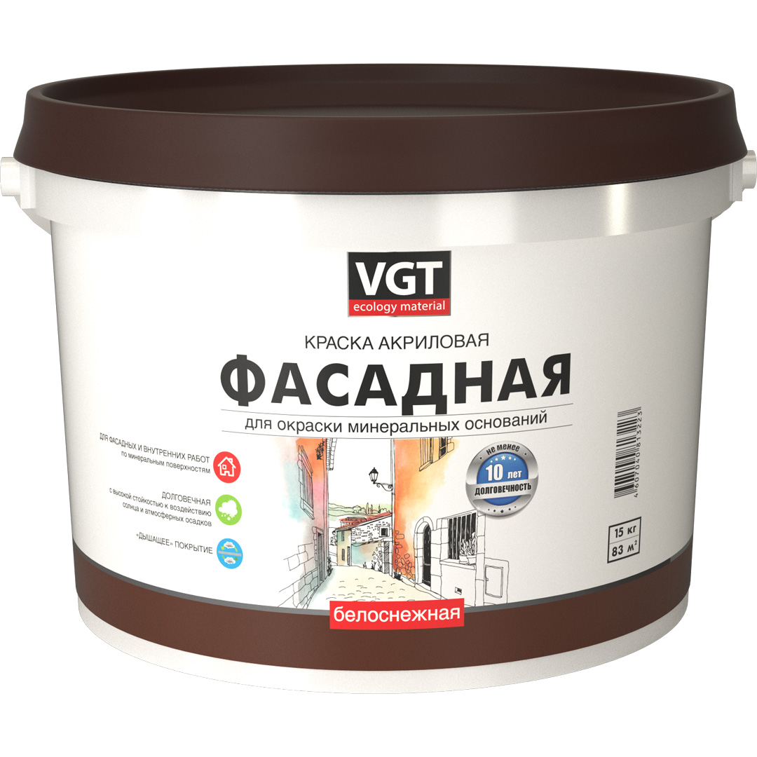 VGT ВД-АК-1180 – фактурная водоэмульсионная краска для отделки минеральных фасадов, отличающаяся высокой долговечностью покрытия.