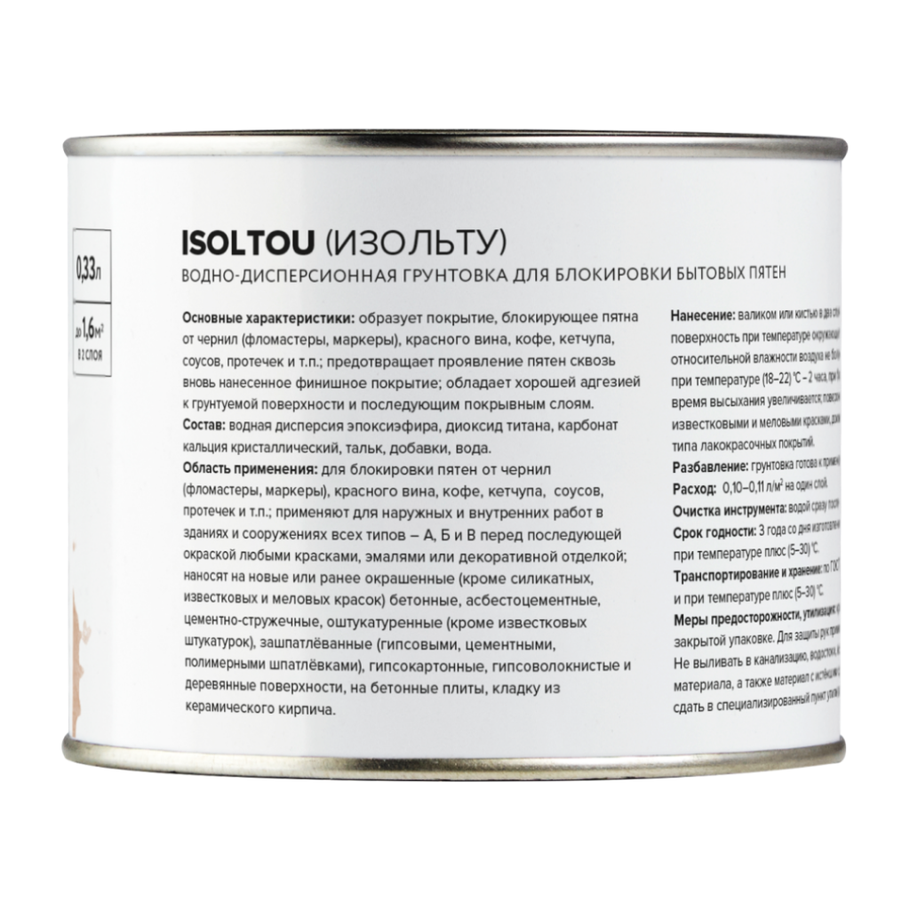 Водно-дисперсионная грунтовка ISOLTOU (ИЗОЛЬТУ) образует покрытие, блокирующее пятна от чернил (фломастеры, маркеры), красного вина, кофе, кетчупа, соусов, протечек. Предотвращает проявление пятен сквозь вновь нанесенное финишное покрытие; обладает хорошей адгезией к грунтуемой поверхности и последующим покрывным слоям.