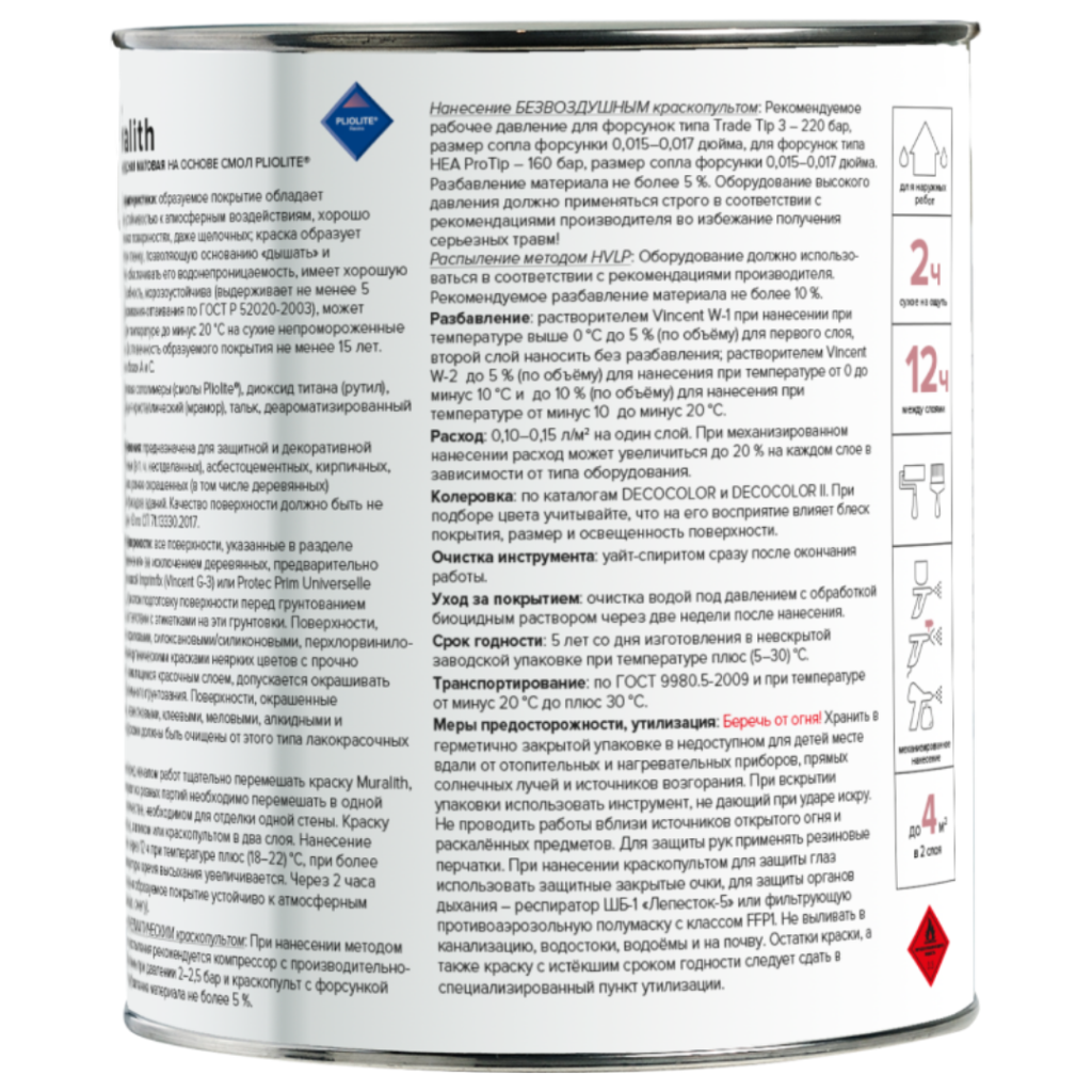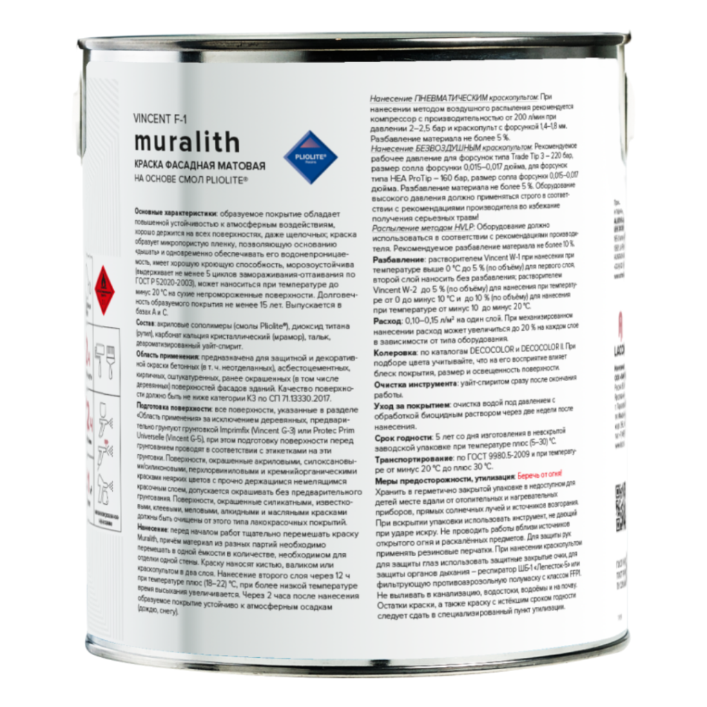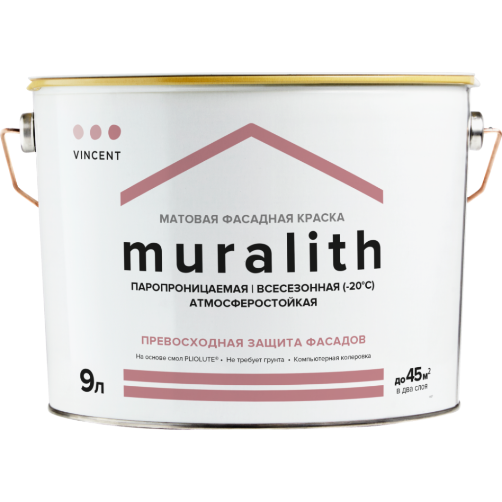 Vincent Muralith F1 - приолитовая всесезонная фасадная краска. Разработана для обновления современных и старинных фасадов зданий, может применяться при отрицательных температурах до – 20 °С на сухие не промороженные основания. Обладает повышенной устойчивостью к атмосферным воздействиям, обеспечивает высокую адгезию ко всем, даже щелочным основаниям, образует микропористую паро- проницаемую пленку, позволяющую основанию “дышать” и одновременно обеспечивать водонепроницаемость, само- очищается. Срок эксплуатации во всех климатических зонах не менее 10 лет. Рекомендуется для применения в зонах с влажным морским климатом.