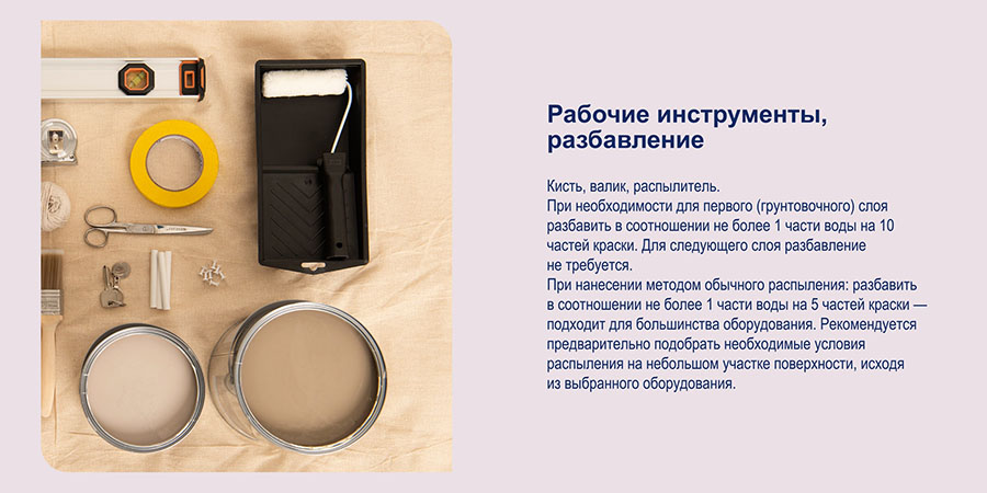 | Разбавление | для первого слоя 1 часть воды к 10 частям краски | |