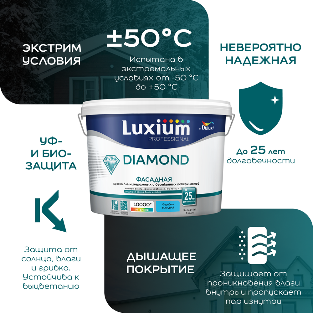Матовая водно-дисперсионная краска для высококачественной отделки минеральных и деревянных фасадных поверхностей, максимально укрывистая, с нейтральным запахом. Благодаря оптимальному сочетанию паропроницаемости и водостойкости образует "дышащее" покрытие, защищает поверхность от проникновения влаги и пропускает пар изнутри.
