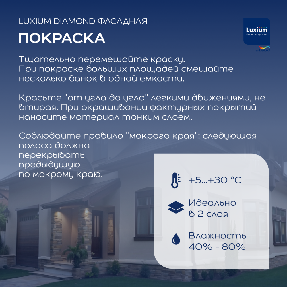 Краску рекомендуется наносить в 2 слоя при температуре воздуха и поверхности от +5oC до +30oС и влажности воздуха от 40 до 80%.
