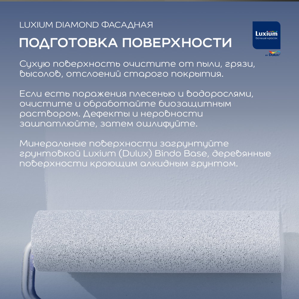 Перед применением тщательно перемешайте. Для укрепления базовой минеральной поверхности, повышения адгезии и уменьшения расхода краски загрунтуйте подготовленную поверхность глубоко проникающей грунтовкой Dulux. Для обеспечения долговечности деревянной поверхности предварительно произведите подготовку при помощи грунтовочной краски или иного кроющего алкидного грунта.