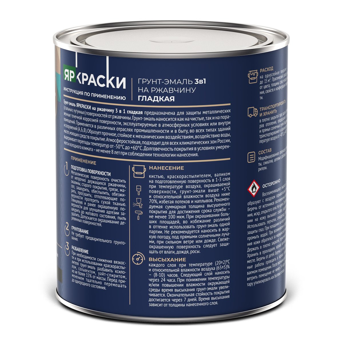 Грунт-эмаль гладкая на ржавчину 3 в 1 предназначена для защиты металлических (стальных, чугунных) поверхностей от ржавчины. Образует прочное, стойкое к механическим воздействиям, воздействию воды, масел, моющих средств покрытие. Атмосферостойкая, подходит для всех климатических зон России, выдерживает перепады температур от -50°С до +60°С. Долговечность покрытия в условиях умеренного и холодного климата – не менее 8 лет при соблюдении технологии нанесения.