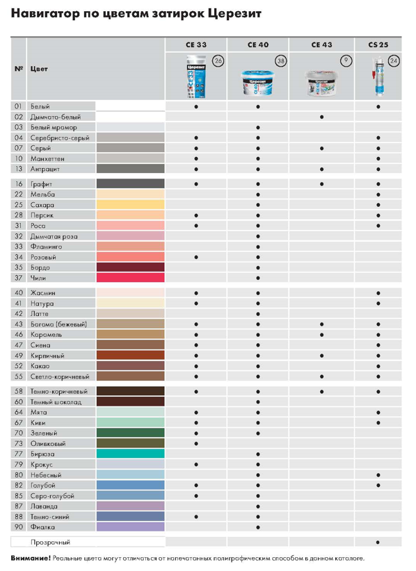 ВысыханиеОкончательный оттенок, заявленный производителем, затирка приобретет через 1-2 суток после того, как швы будут заполнены. Точное время зависит от влажности и температуры воздуха. Когда затирка полностью высохнет, она может отличаться по цвету от смеси в сухом виде, образцов в рекламе и оттенка маркера на упаковке.